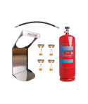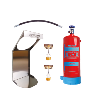 Sistema de extinción compuesto por: -Depósito de 9 litros con base (1 ud.) - Soporte de pared 9 litros (1 ud.) - Latiguillo de conexión (1 ud.) - Sprinklers 141ºC de pared horizontal cromado (4 uds.) - Válvula de disparo (1 ud.) - Manómetro de válvula 27 mm (1 ud.) -Alcance: Campana mural de 6 m. / Campana central de 3m. -Máximo de rociadores: 6.